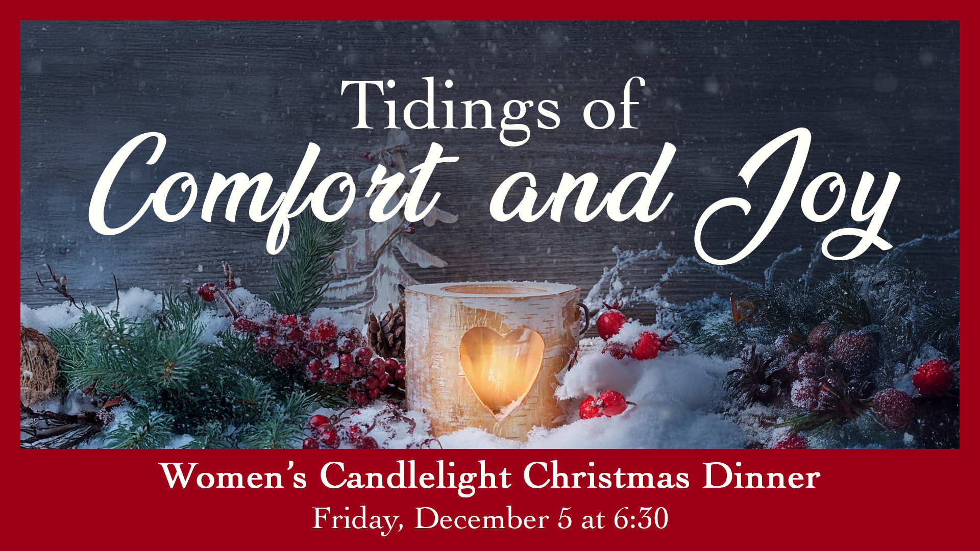 It is with hearts full of comfort and joy that we invite you to this year’s Women’s Candlelight Christmas Dinner, “Tidings of Comfort and Joy”! Join us on Friday, December 5 at 6:30 PM in the sanctuary for a beautiful evening filled with the warmth of friendship, the glow of candlelight, and the celebration of our Savior’s birth.